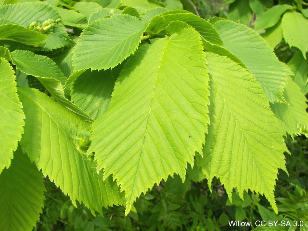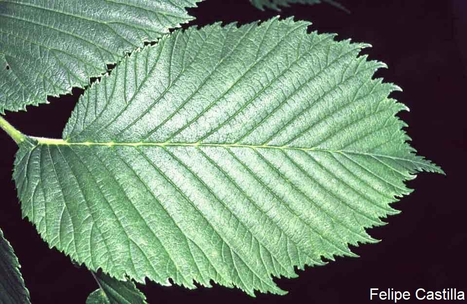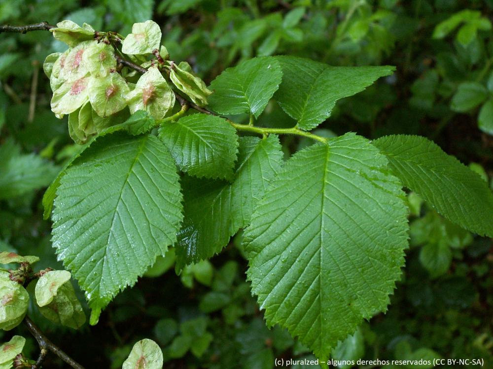 El nombre común en euskera te dará una pista para distinguir los dos tipos de olmo que se encuentran en Uriguen. Este es el único olmo autóctono del País Vasco y tiene la hoja bastante mayor que la del común (Ulmus minor) que tienes unos metros más atrás.