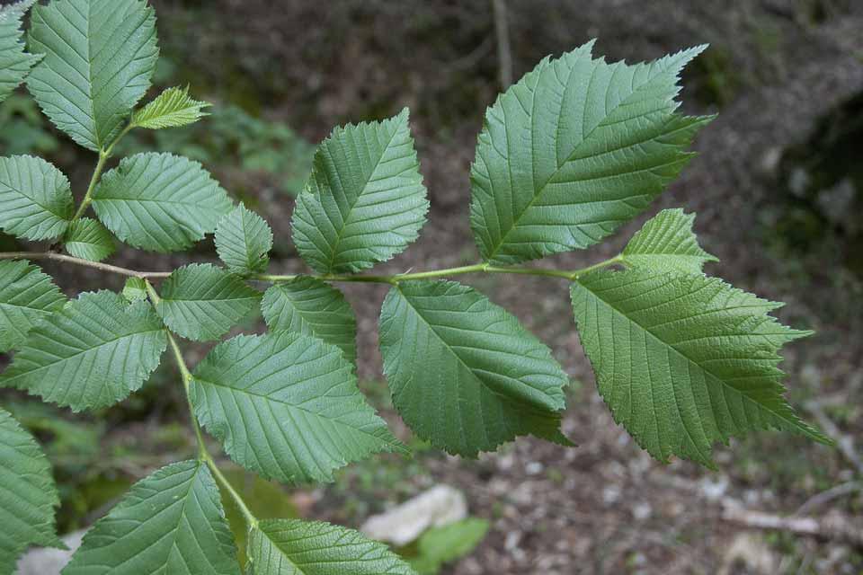 Una característica que comparten los dos es la forma asimétrica de la base de la hoja, pero en el de montaña el lóbulo casi oculta el rabillo de la hoja que lo une a la rama.