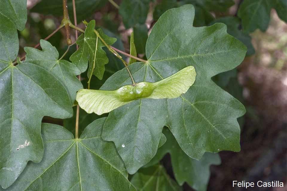 Las hojas palmeadas penden de un rabillo largo y rojizo y tienen la particularidad que al ser cortadas segregan un látex, lo que te ayudará a distinguirlo de otro arce muy similar, pero de hoja más pequeña, el arce de Montpellier.