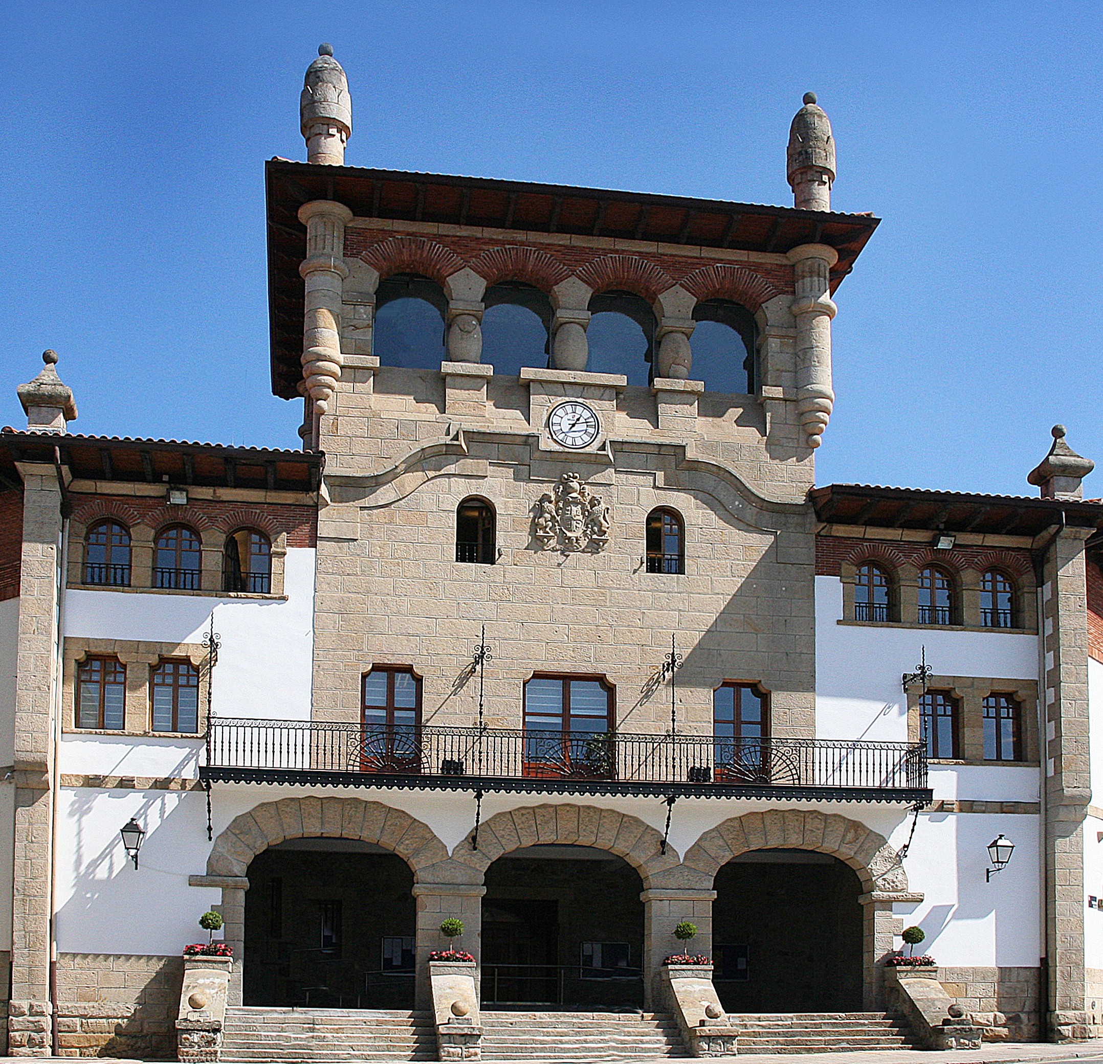 El ayuntamiento, levantado por Araluze en 1927; siguiendo propuestas del castreño Leonardo Rucabado; es un edificio con influencias del neocantabrismo. Elemento muy característico de los ayuntamientos vascos es el amplio soportal con arcada de medio punto, o el entramado y ladrillo de los laterales de la torre.