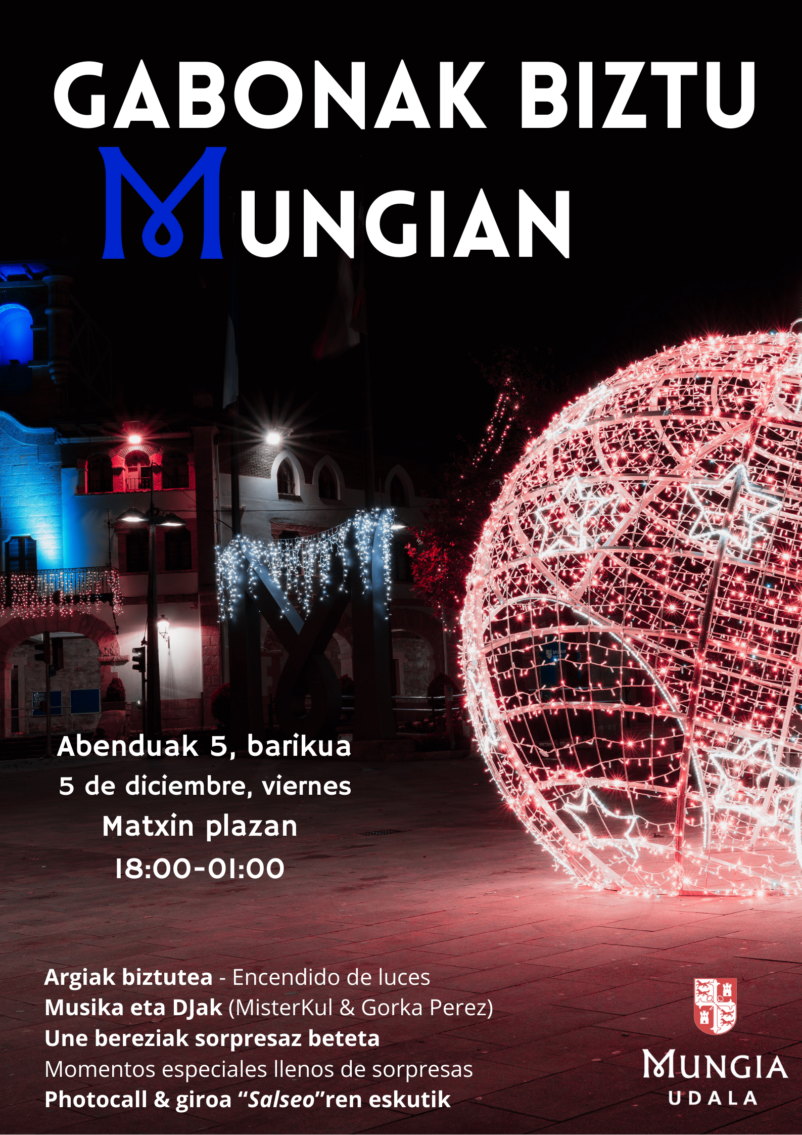 El Ayuntamiento de Mungia celebrará el próximo 5 de diciembre el evento “Gabonak Biztu Mungian”, un encuentro festivo que marcará el inicio de la Navidad en el municipio. A partir de las 18:00 horas, Matxin Plaza se convertirá en el epicentro de la magia navideña con el encendido oficial de las luces y una programación pensada para el disfrute de toda la ciudadanía.