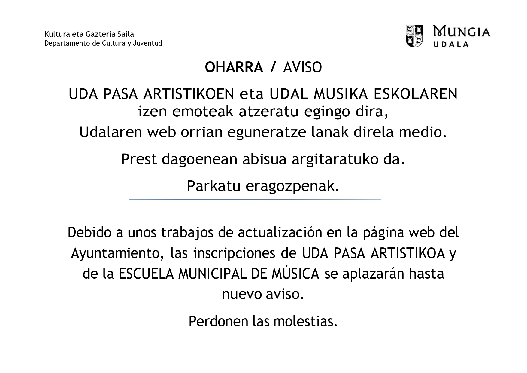 Debido a unos trabajos de actualización en la página web del Ayuntamiento, las inscripciones de UDA PASA ARTISTIKOA y de la ESCUELA MUNICIPAL DE MÚSICA se aplazarán hasta nuevo aviso. Perdonen las molestias.
